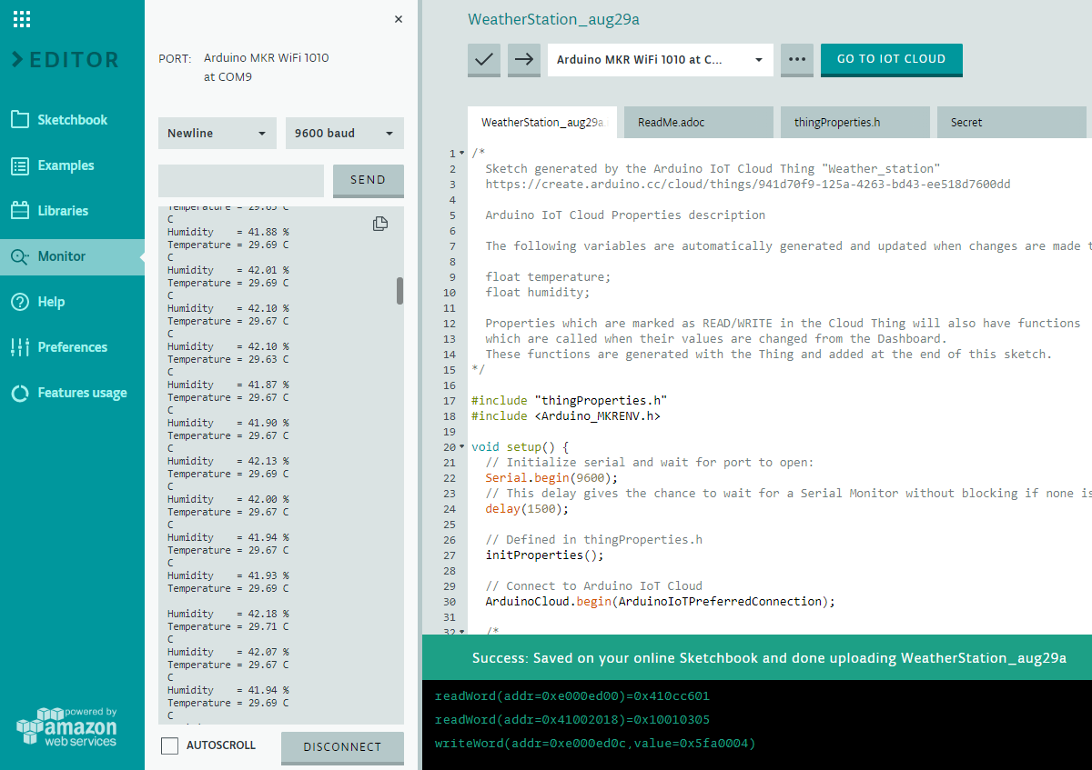 Once the code has been uploaded, hit the Serial Monitor icon. You will see how the board connects to your internet connection, next to the Arduino Cloud, and next will start printing out data being obtained from the sensors once every ten seconds.