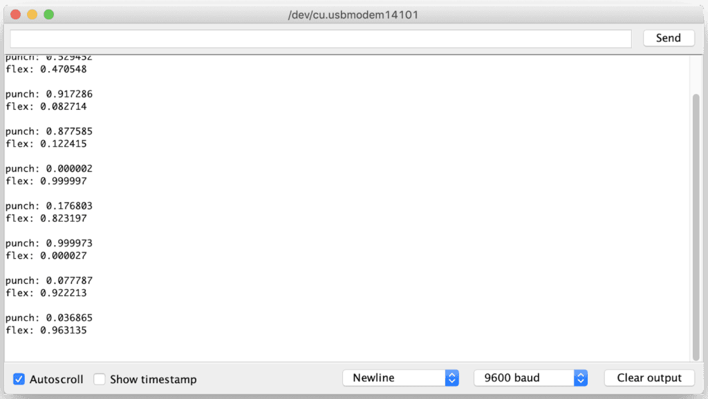 • The confidence of each gesture will be printed to the Serial Monitor (0 = low confidence, 1 = high confidence)